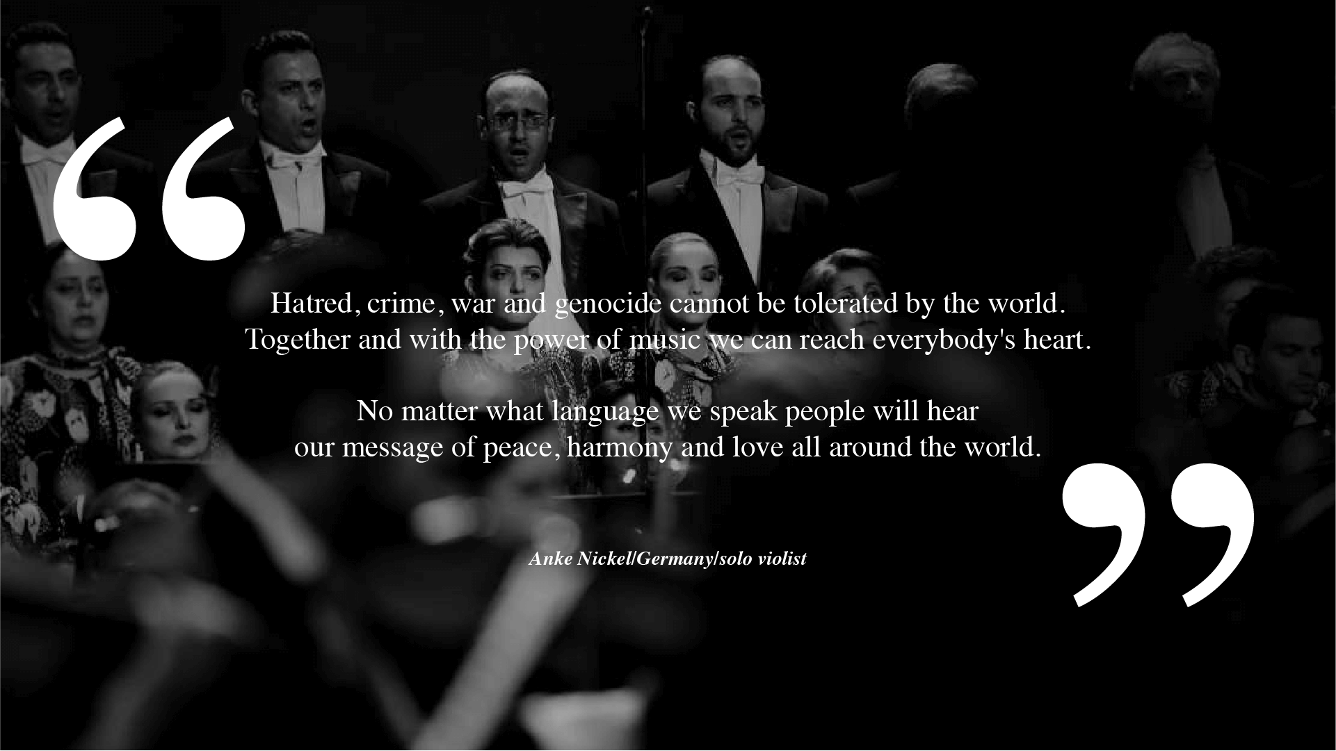 24/04 World Orchestra is a unique pan-Armenian cultural project that brings together musicians from all over the world and has a mission to attract the attention of humanity to the issue of recognition and condemnation of the Armenian Genocide and preventing future crimes on ethnic grounds through promotion of diversity and harmony of different cultures.