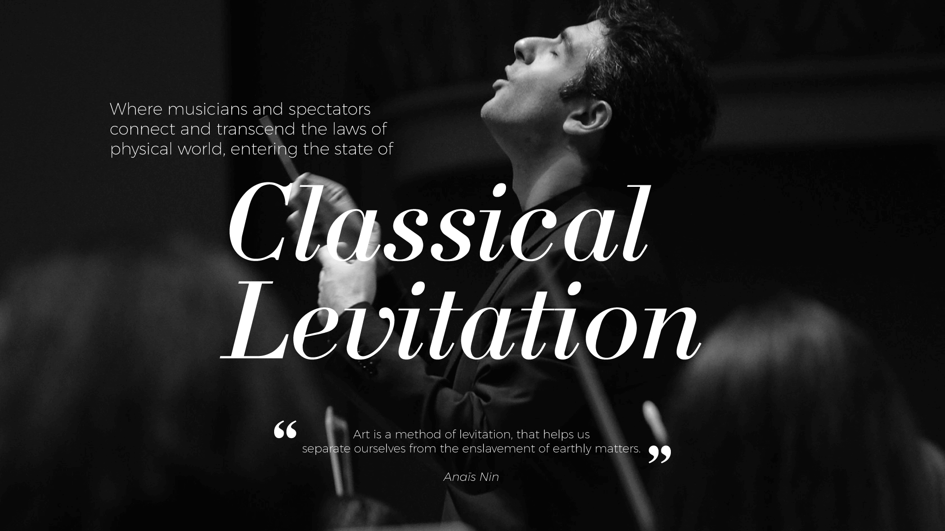 It was a state we all found ourselves in and should find a name for it. A state of body and soul energized with creative energy and higher values, to do something big, to fly high, find yourself in a world where everything stops for a minute, and there is nothing else that can bother you. It is a state when you find yourself in a state of levitation.Brand concept name “Classical Levitation” is a wordplay where classical has two conotations: the music genre itself and an exemplary standard of doing something.This finding led us to build the visual identity of the brand where ease and overcoming gravity were the cornerstones, and monochrome implementation were chosen to once again stress the pureness and the beauty of classical music. We came up with a dynamic logotype that reflected a spontaneous and unpredictable rise and hovers in the air affected by magical powers.We hope that each time you attend a musical feast performed by The Orchestra it will make you transcend the laws of the physical world, entering the state of classical levitation.
